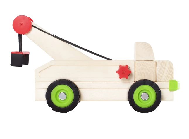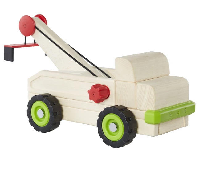 - Large wooden toy tow truck with plastic parts teaches children about simple machines like wheels and axles