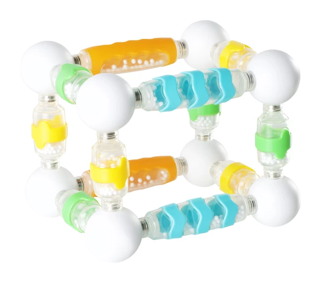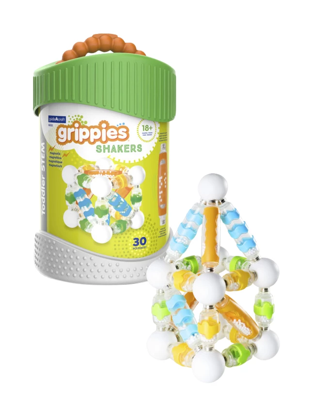 Grippies Shakers bring kinetic energy and sound exploration. Connect the two-sized, magnetic roads to each other or combine them with the over molded metal ball connectors to create a uniquely soothing acoustic building experience. Toddlers can watch the sensory beads rattle their way down the magnetic rods through clear ABS plastic windows.