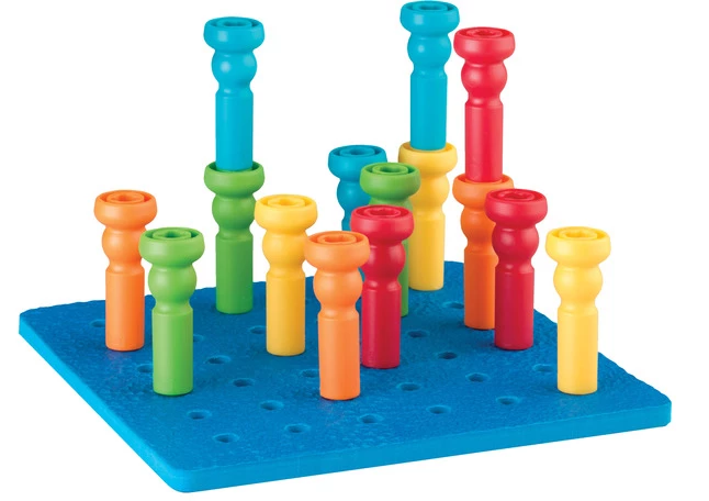 - All 25 sturdy plastic tall stacking pegs are easy for all sized hands to grasp and place anywhere on 36-hole pegboard