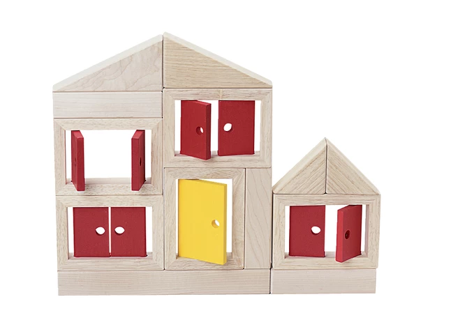 - Bold red windows and yellow door add modern splash to natural wood block pieces