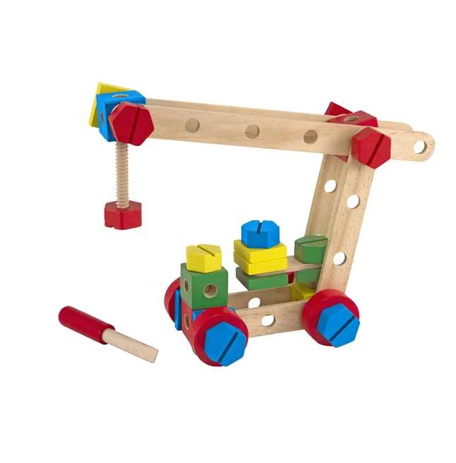 With 48 wooden pieces, this classic building set gives kids all they need to tinker and build! Printed right on the sturdy storage box are building plans for a crane, motorcycle, airplane, and a race car to get the fun started. With some imagination and a few creative twists and turns, kids can make hundreds more amazing structures.
