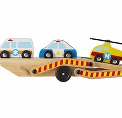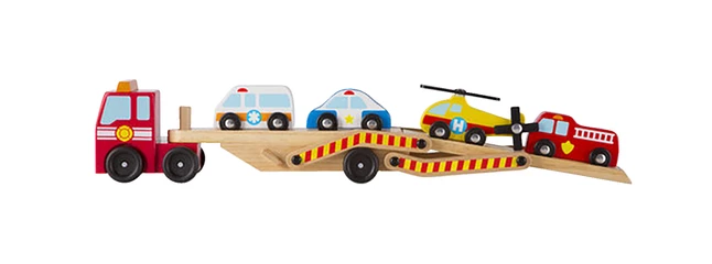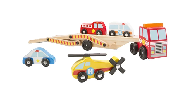 Lower the upper deck to extend the truck to nearly two feet long and to allow the vehicles to roll off and race to the rescue. Thereβs a helicopter with rotating blade, a fire engine, police car, and ambulance, so kids can respond to any imaginative emergency. Classic design and sturdy construction is sure to last through years of hands-on play, and smoothly moving parts help kids three and older develop fine motor skills, movement, and hand-eye coordination.