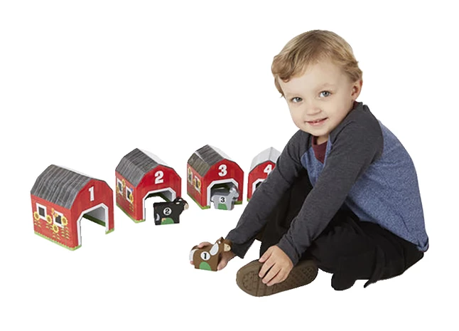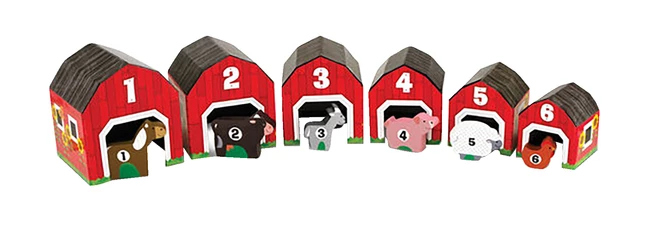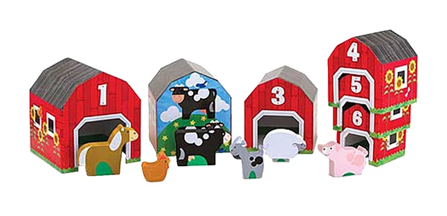 Take six nesting and sorting blocks, add six numbered animals to go inside, and what do you have? A farm full of stacking, counting, hide-and-seek, mix-and-match, imaginative play! This charming play set lets kids build a farm scene filled with bright red barns, with an animal for every barn. On their front panels, the barns feature doors sized to fit their animal occupants; on the back, a full-color scene showing the animal in an outdoor setting.