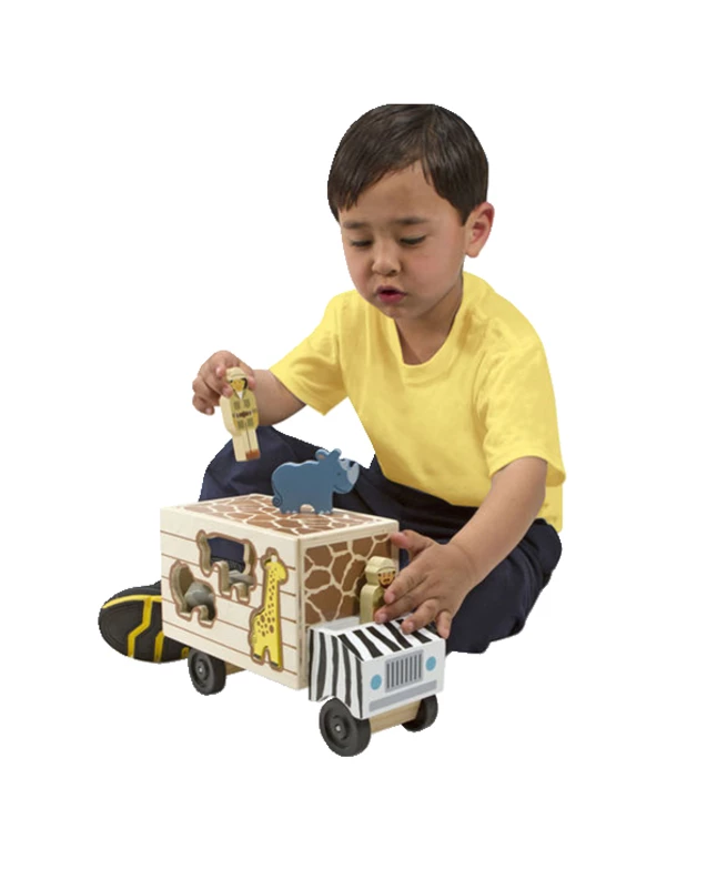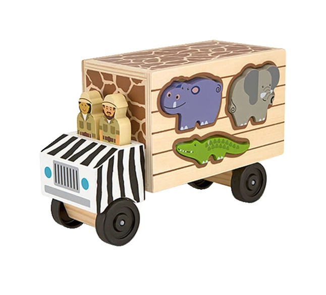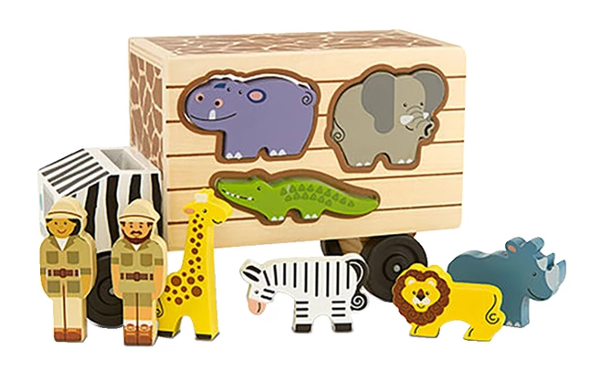 With this rugged safari truck, two cheerful people are ready to zoom across the savanna to help their animal friends. The animals fit into the sides of the wooden truck through die-cut slots. Lift and remove the cargo door to unload the colorful animals, then count and stack the solid-wood pieces before loading the truck and securing the door in its track. One male and one female ranger fit in the cab of the truck, or they can come out to tend to the animals on the preserve.