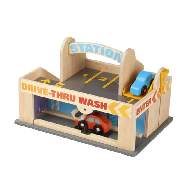 Park the two included wooden cars in the parking garage with movable elevator or pull them through the car wash. Donβt forget to fill up at the gas pump before getting the cars serviced at the garage with sliding doors. The built-in handle makes it the perfect take-along toy.