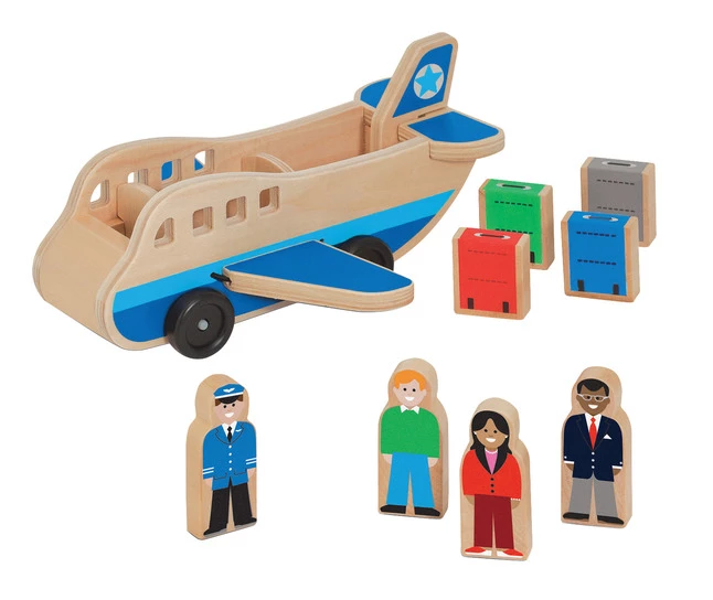 - Nine wooden pieces, including four play figures, four suitcases, and one airplane
