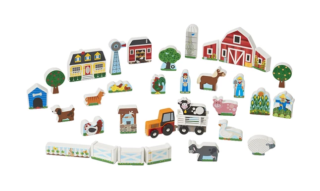Build and cultivate a world filled with imagination โ block by block! The 33-piece set of farm-themed animals, buildings, and play pieces includes a wheeled tractor that pulls a flat-bed trailer, sized to transport the farm animals all around the farm! The wooden blocks re brightly decorated on one side and are great for stacking, sorting, counting, and building.