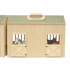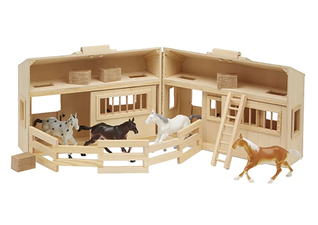 Itβs a natural! With a decorative green βshingledβ roof, this wooden stable provides a happy home for four plastic horses. When open, your little farmer or equestrian has easy access to the hayloft, with its wooden ladder and four bales of βhay.β Thereβs a stall for each of the four included horses, lots of sliding and swinging doors and a folding corral to keep the horse in the barnyard. Includes 4 horses.