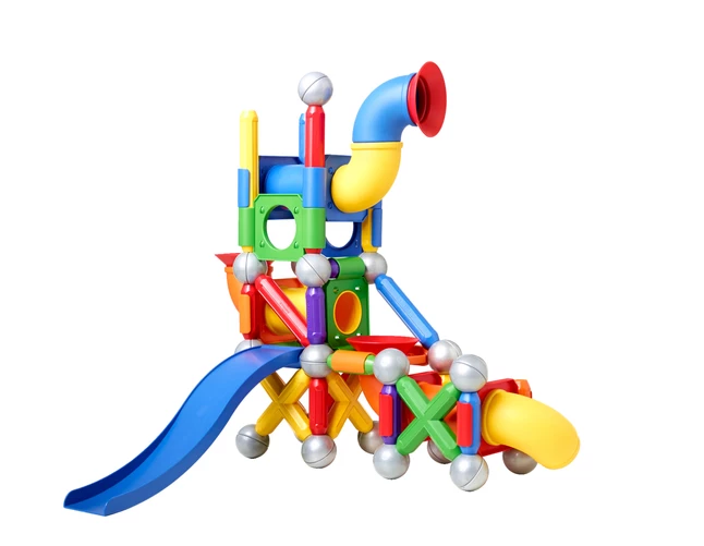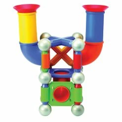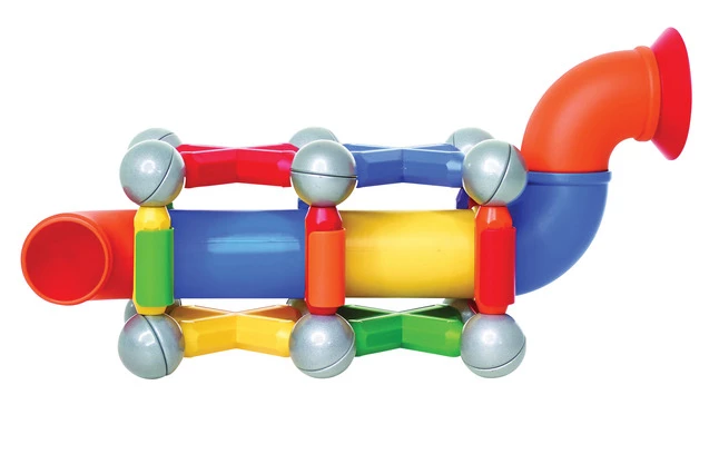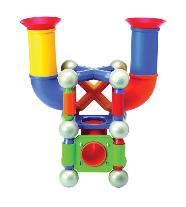 Includes: (14) Medium bars (2 purple, 2 green, 2 yellow, 2 orange, 3 blue, 3 red) , (4) Long bars (1 each of blue, green, yellow, red), (4) XL Bars (1 each of blue, green, yellow, red), (4) X-shaped bars (1 each of blue, green, yellow, red), (24) Metal balls, (9) Panels with holes (2 red, 2 green, 2 orange, 3 blue), (5) Curved tubes (2 orange, 2 yellow, 1 blue), (1) Blue ramp , (3) Red funnels, (3) Straight tubes (1 yellow, orange and blue)
